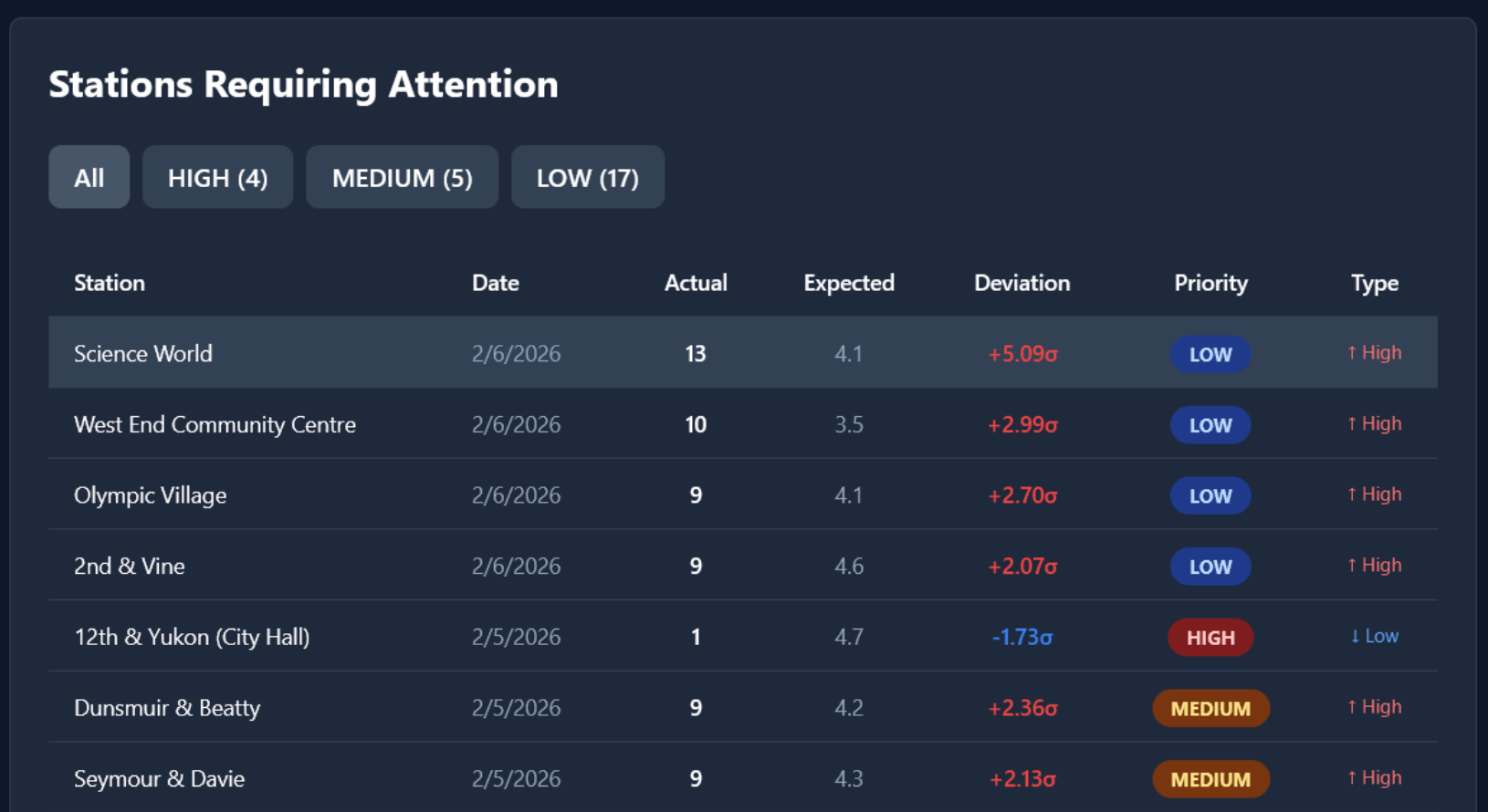 A React dashboard summarizes system health and ranks stations requiring attention, designed specifically for non-technical operations users. Otto created custom rules, automated analysis triggers, and intelligent alerting that transforms raw anomaly data into operational intelligence.
