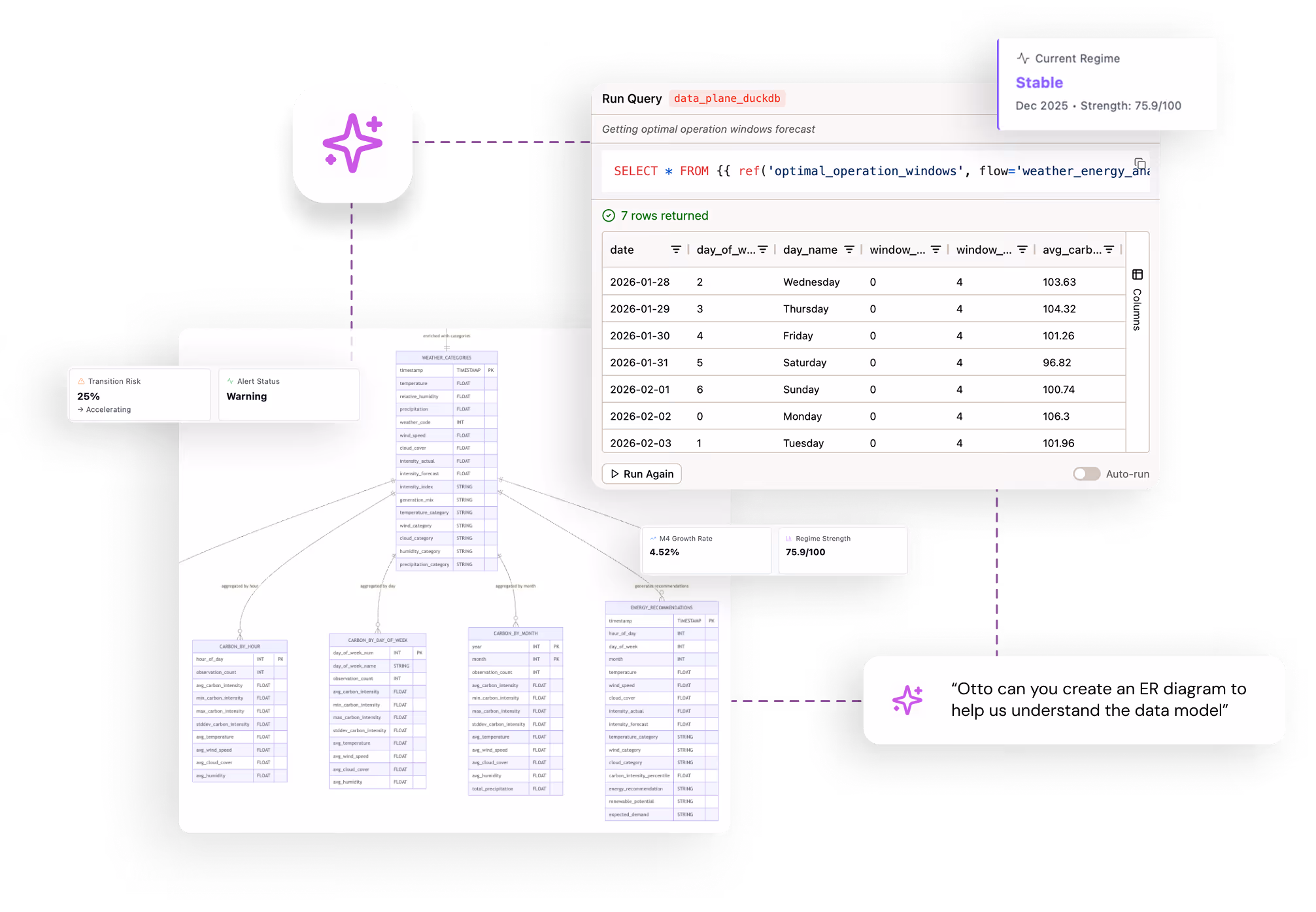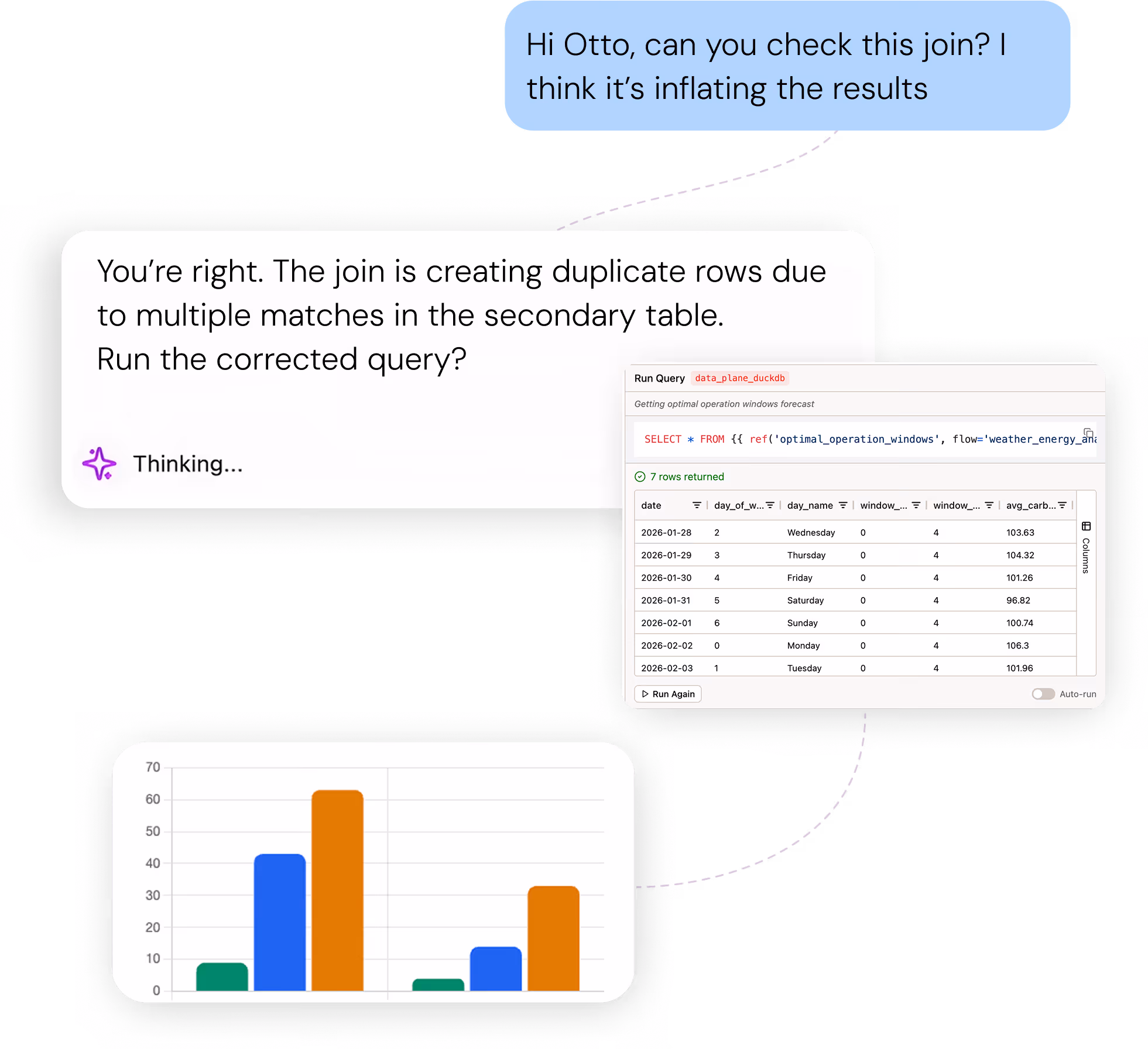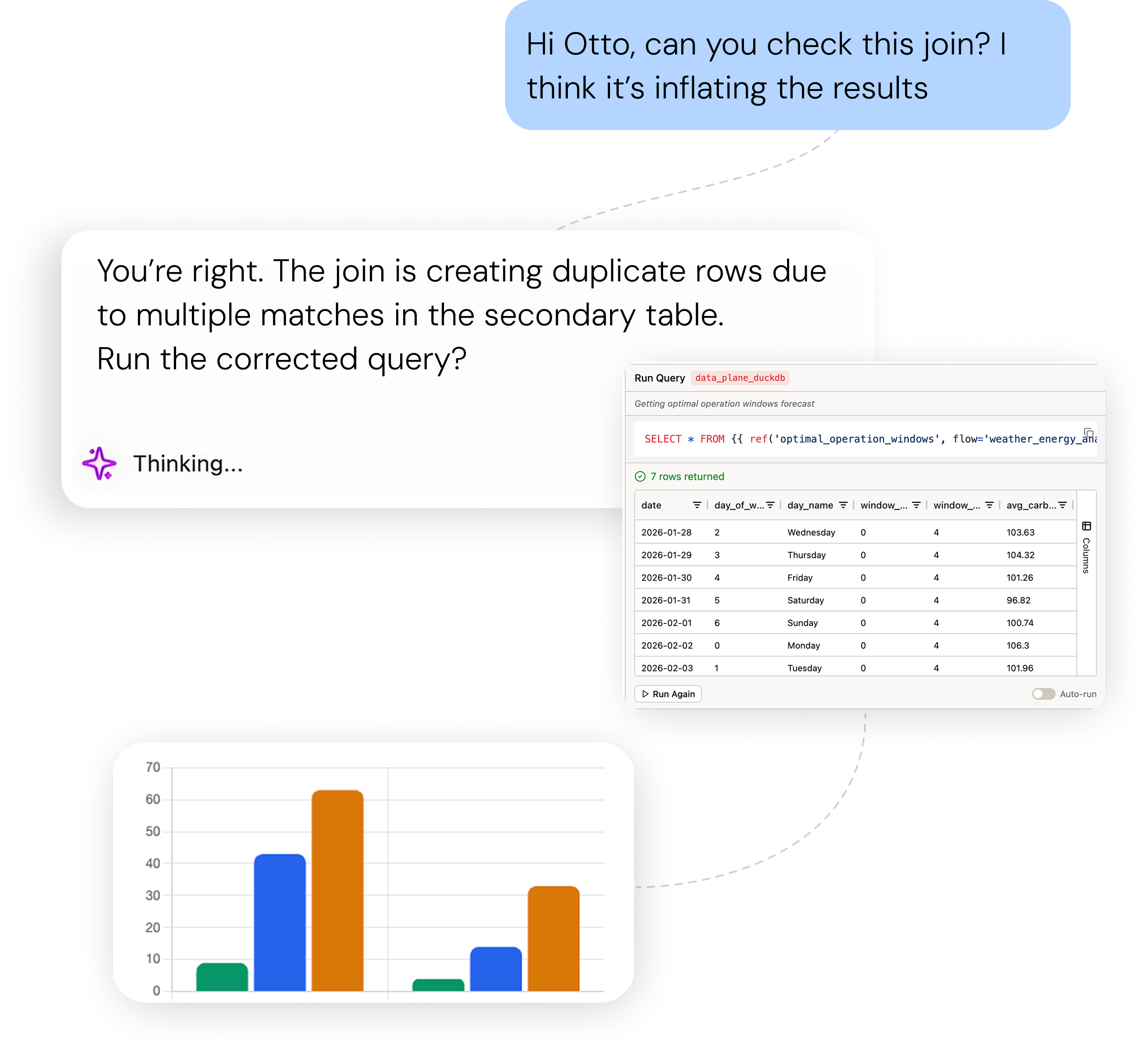 Need a bar chart? A trend analysis? A custom dashboard? Just ask Otto. AI agents generate visualizations instantly — whether you’re an engineer validating pipeline outputs or an analyst exploring new datasets. No SQL required, no context switching, no waiting.