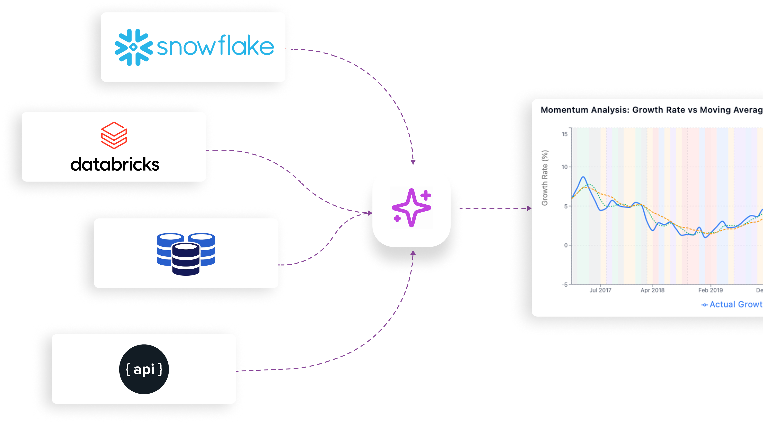 Query and visualize across Snowflake, Databricks, APIs, and databases without switching tools or contexts.